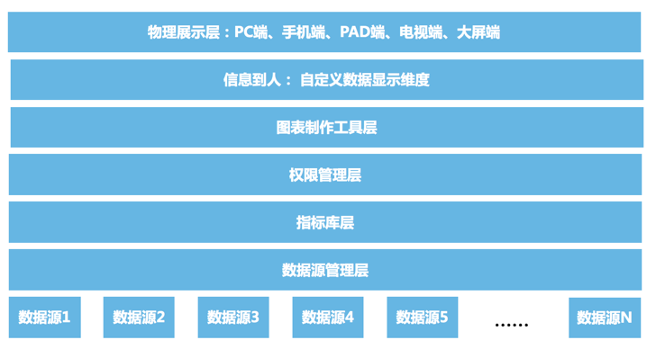 信息门户模块整体架构如图所示,包括数据源管理层、指标库层、权限管理层、工具层和显示层,通过几层的配置和管理操作,即可完成信息可视化系统的建设工作。
