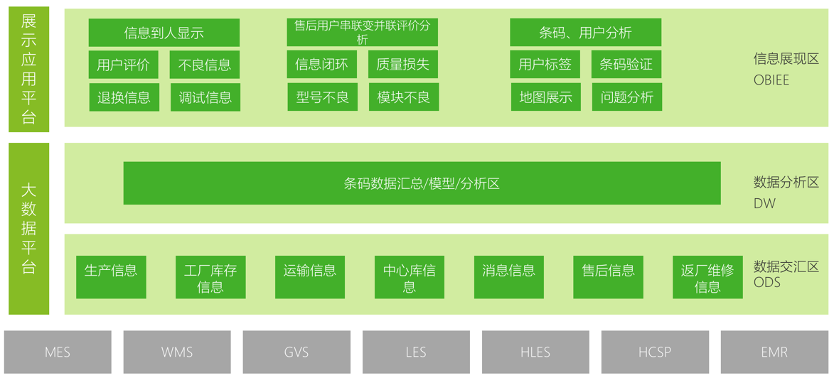 该模块采用四层架构,基于大数据平台,通过EDW实施方法论,业务蓝图及数据需求将海尔供应链各个节点条码、二维码数据以及海尔用户各个方面行为数据使用ETL工具按照数据规范统一手机至大数据平台中的ODS中;并使用基于第三范式实体-关系模型建模方式在DW中建立条码大数据模型及用户大数据模型,采用手机App、OBIEE等展现方式将这些模型与售后信息关联显示,实现售后信息到人。