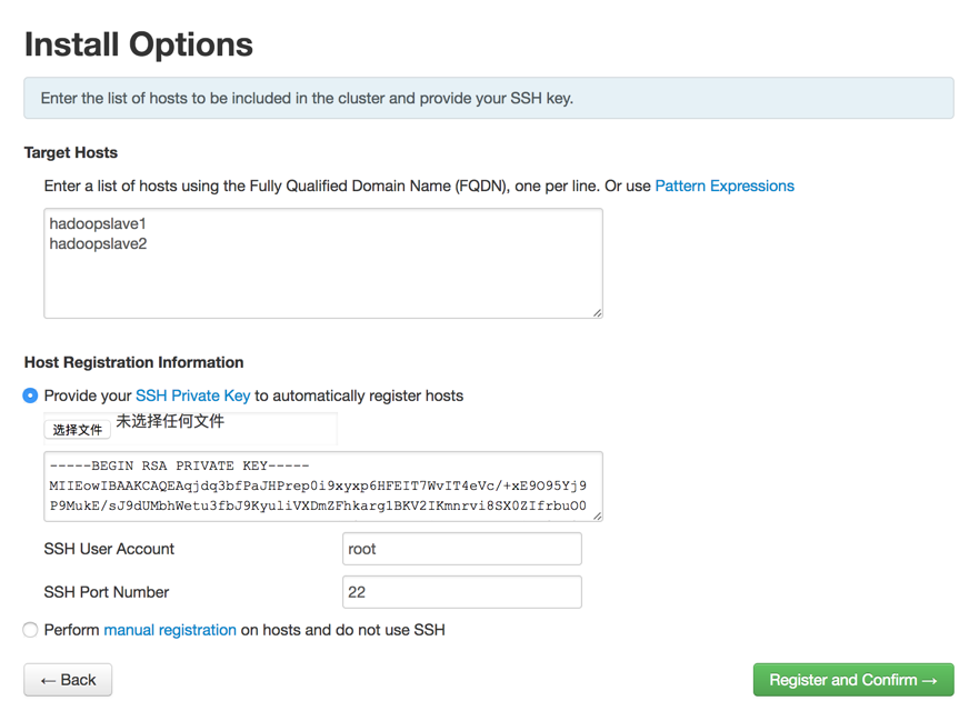 选择hadoopmaster的root私有文件。目录/root/.ssh/id_rsa